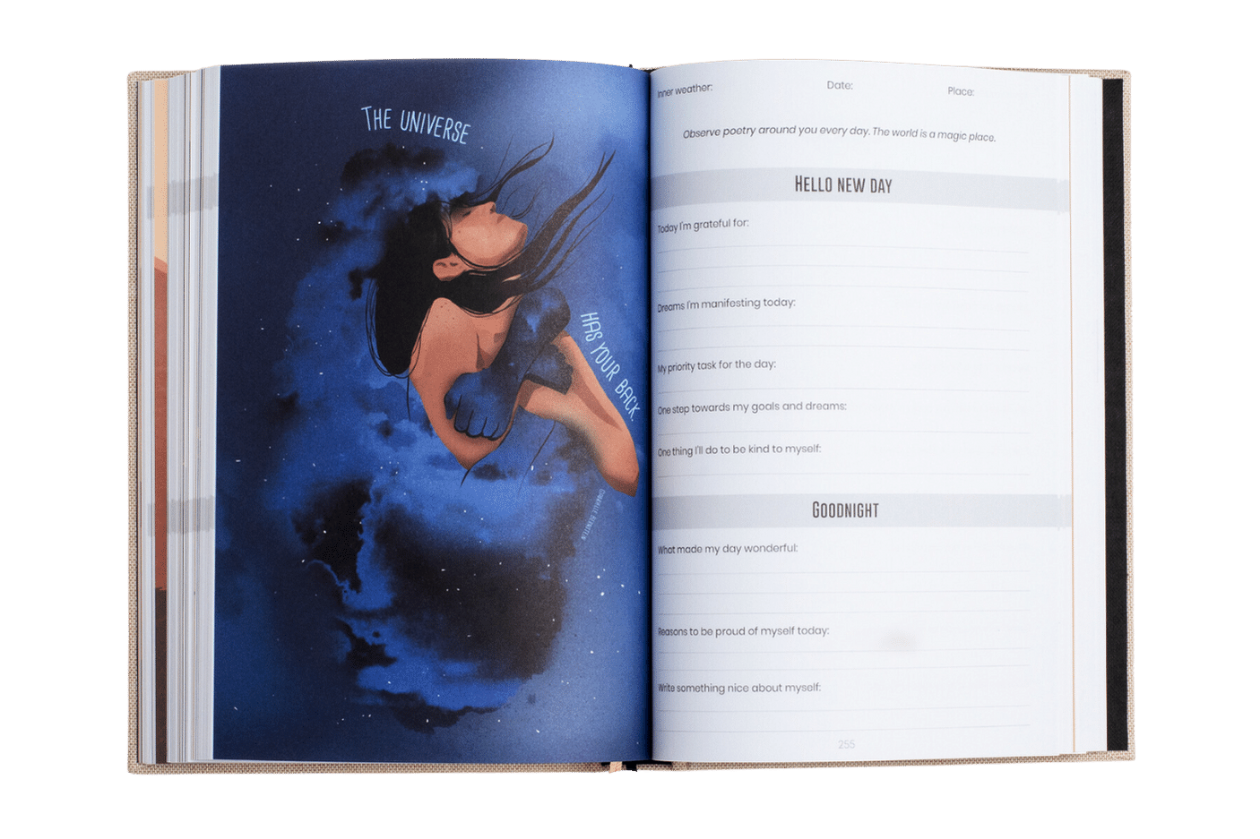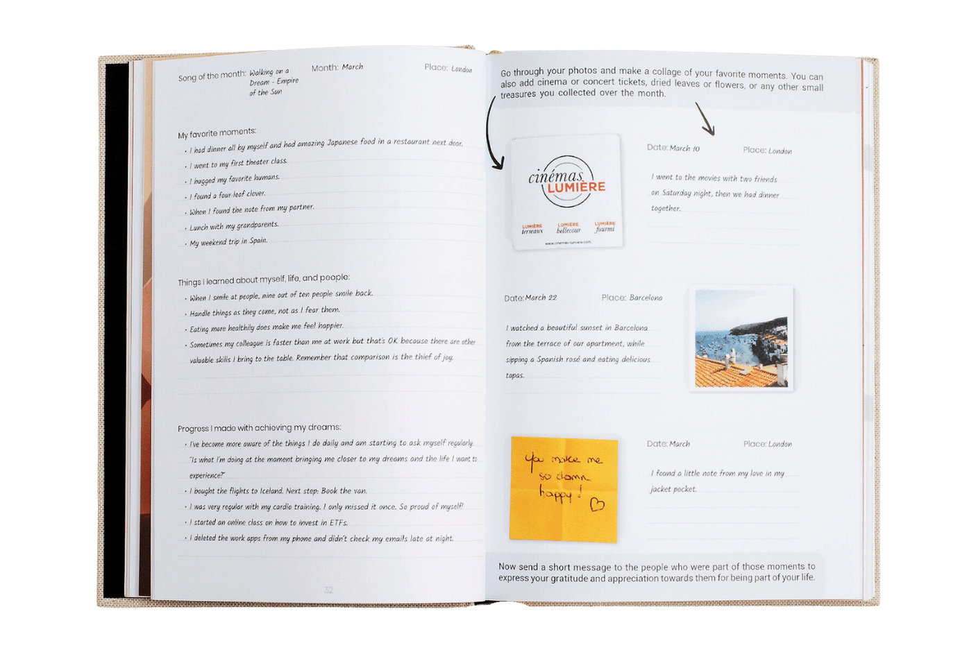 The journal helps you to escape your negative spiral and become more optimistic and happier, by inviting you to identify all the beautiful things in your daily life.